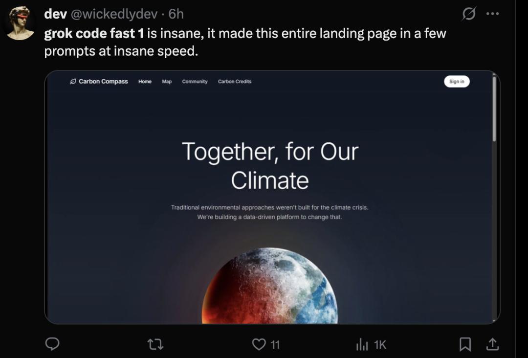 Grok Code Fast 1 在社交平台上引发热议。在 X 平台,有试用过该模型的用户表示,它以疯狂的速度在几个提示中就制作了整个登陆页面。