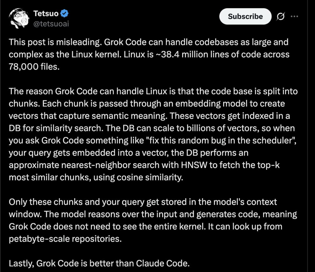 上述观点有误导性。Grok Code 可以处理像 Linux 内核一样庞大复杂的代码库。Linux 大约有 3840 万行代码,分布在 78,000 个文件中。