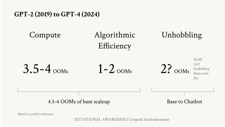 「数量级」(Orders of Magnitude,即「OOM」)的概念对于讨论至关重要。Aschenbrenner 使用数量级(OOM)来评估 AI 能力、算力和数据消耗的进步,OOM 指给定指标的十倍增长。就计算能力和数据可扩展性而言,从 GPT-2 到 GPT-4 的转换代表了许多 OOM。