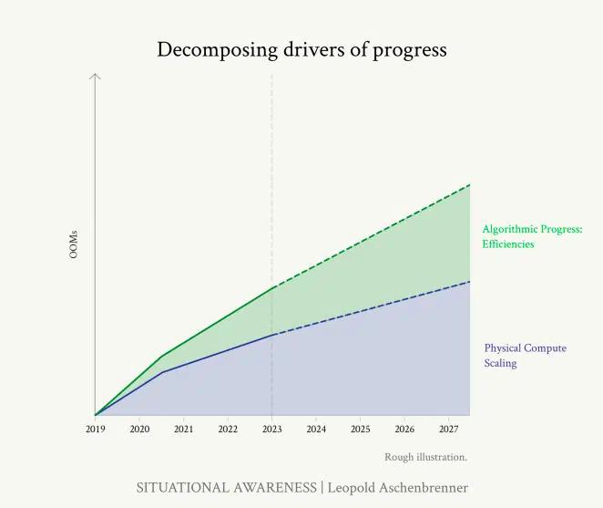 Leopold Aschenbrenner 强调了到 2027 年实现通用人工智能(AGI)的可能路径。他认为,在业界持续投入算力,提升算法效率的前提下,我们或许能够让 AI 系统在众多领域上与人类智力匹敌,甚至超越人类。
