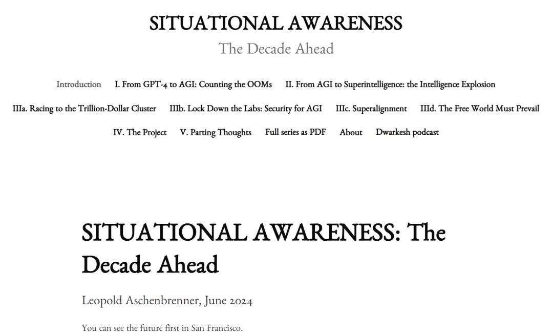 两个月后,他发布了一篇 165 页的分析文章《Situational Awareness: The Decade Ahead》,在硅谷引发广泛关注。