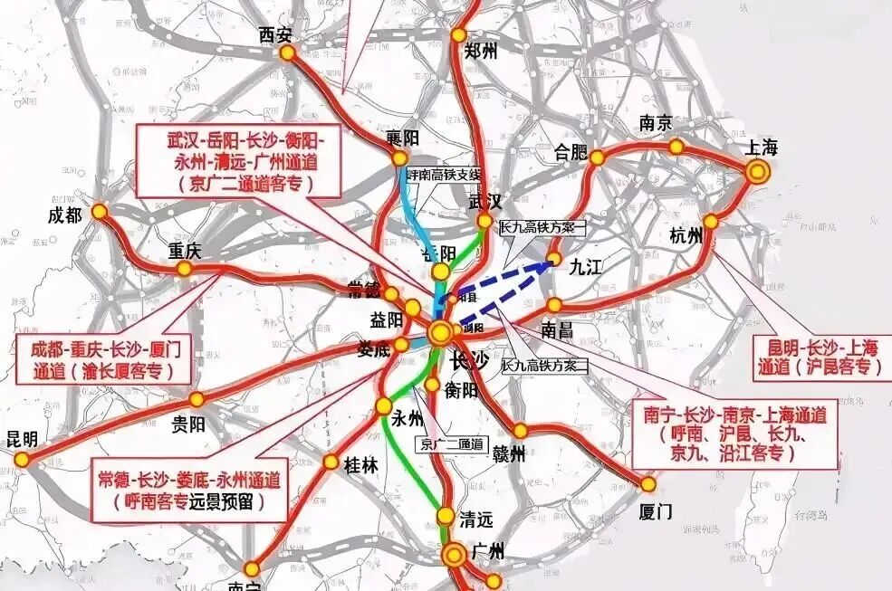 值得注意的是,长沙至九江高铁和长沙西至沪昆高铁连接线两个项目,是长沙打造“米”字形高铁枢纽的关键所在。