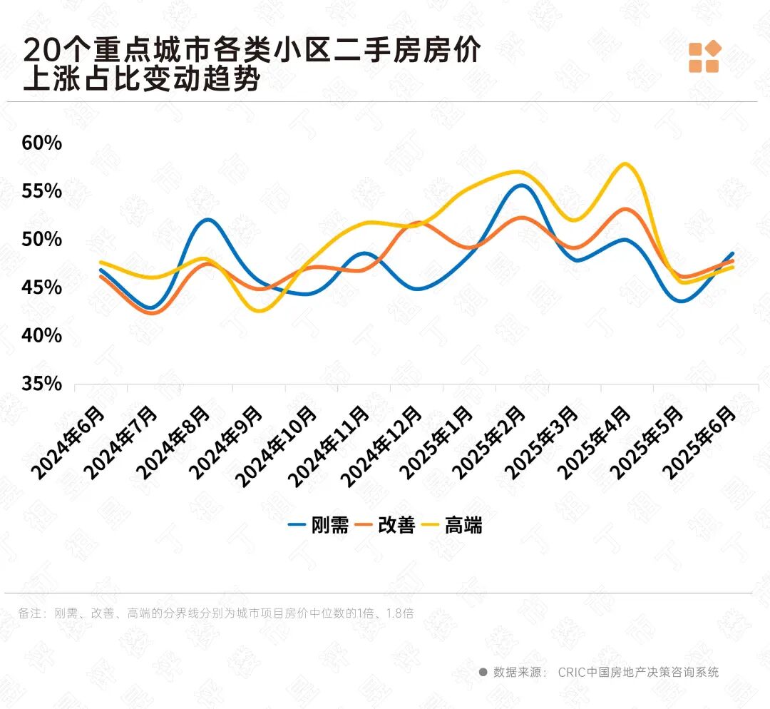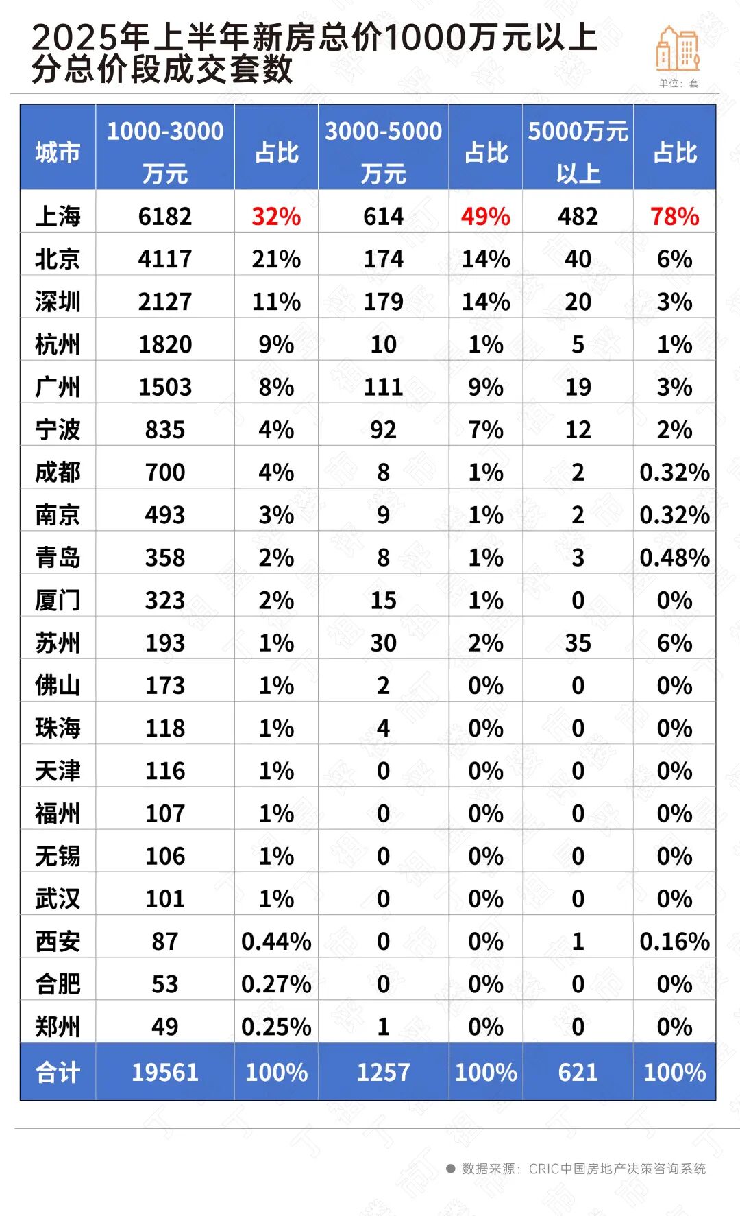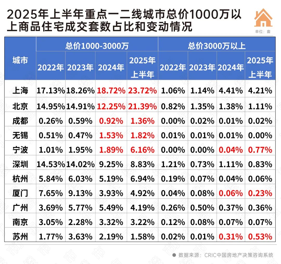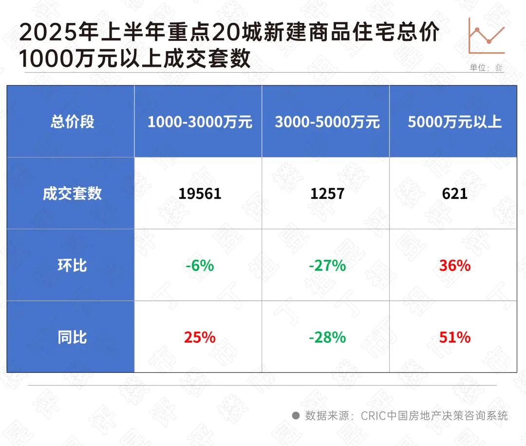 CRIC数据显示,2025年上半年20城总价1000万元以上商品住宅共成交2.1万套,环比微降7%,同比增长21%,而百城新房成交上半年同比仅微增5%。