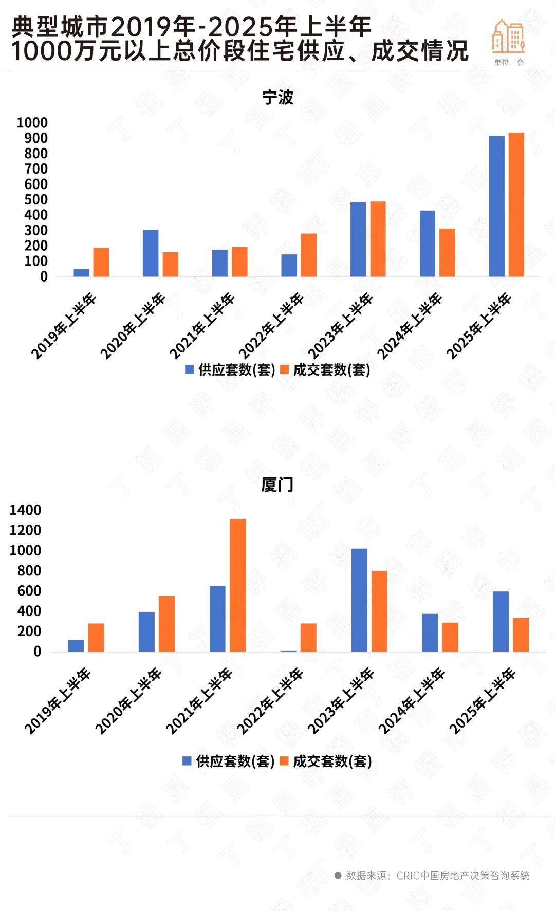 因高溢价地块占比上升,宁波、厦门等个别城市也迎来了豪宅供应量的大爆发,因而也带动千万豪宅成交稳中有增。典型城市如宁波,2025年上半年总价1000万元以上新房供应达到919套,同比增长113%,受供应放量带动,全年千万豪宅成交规模升至939套,同比增长近两成。