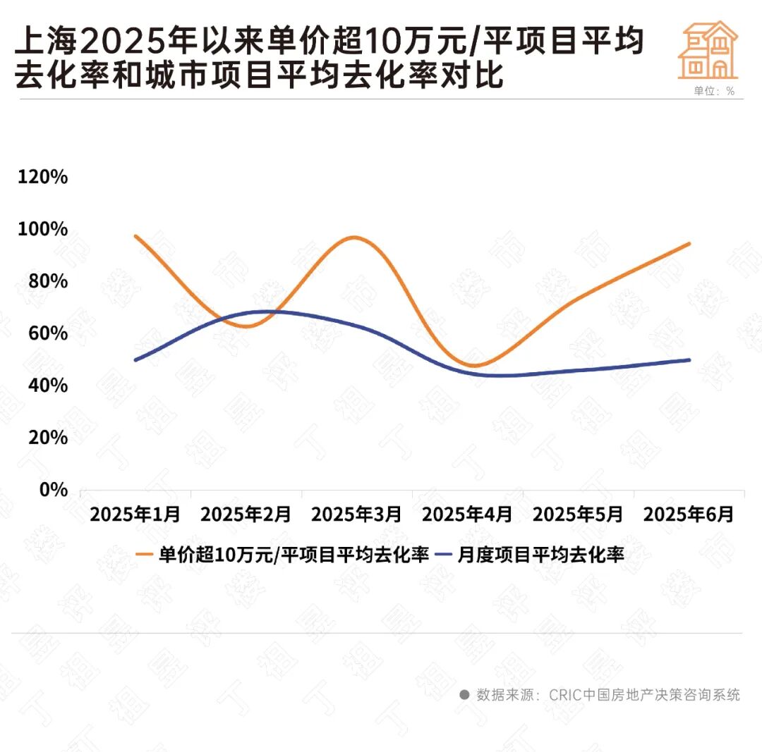 一线城市以上海为例,对比2025年以来单价超10万元/平项目开盘首日平均去化率基本在6成以上波动,6月冲高至95%。