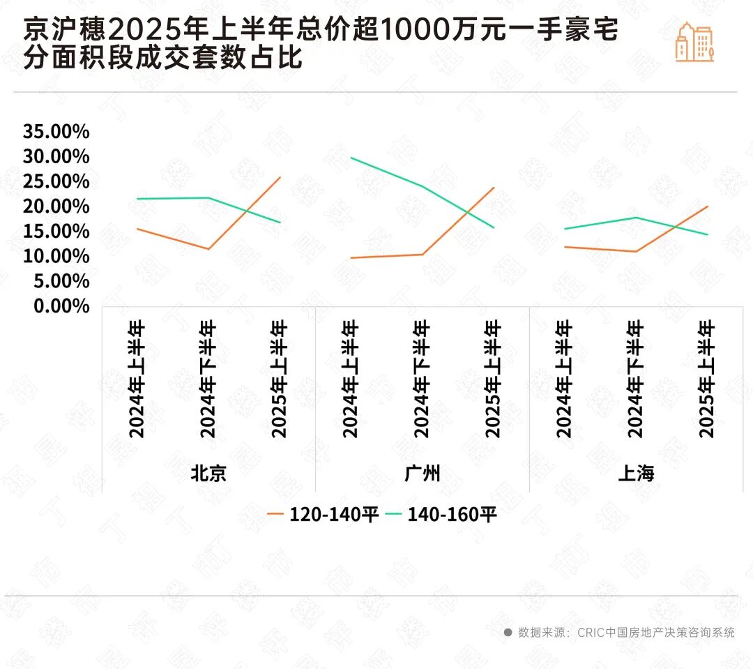 第一类城市以北京、上海、广州等一线城市为典型代表,2024年三城千万豪宅主要以140-160平为成交主力,而后成交占比呈现出逐年下行走势,与之形成鲜明对比的当属120-140平,成交占比逐年递增,2025年上半年成交占比均增至20%以上。