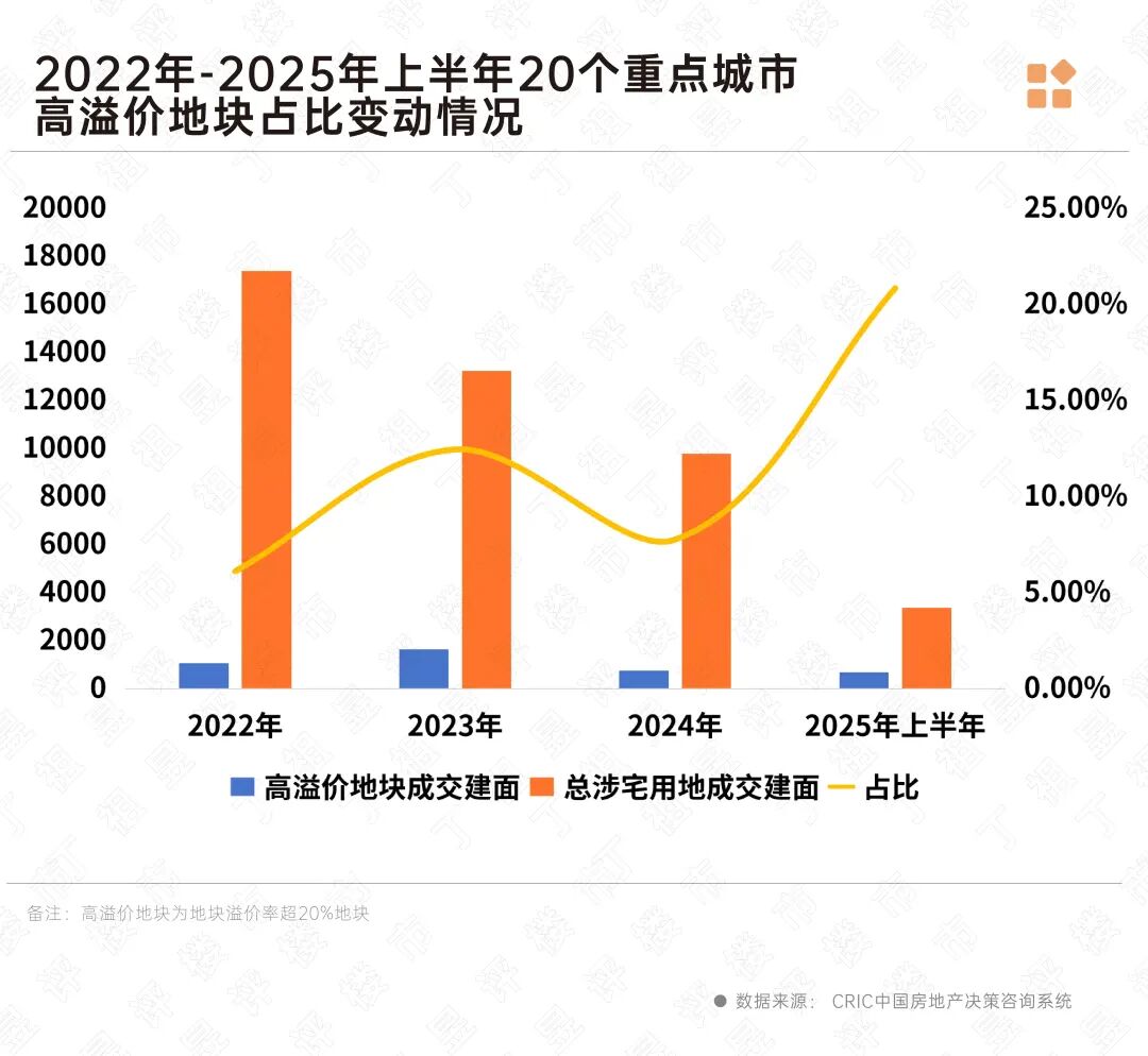 据CRIC监测数据,2022年以来20个重点城市高溢价地块占比持续上升,2025年上半年溢价率超20%地块占比高达20.86%,较2024年全年上升13.08个百分点,为豪宅项目供应放量打下了坚实基础。