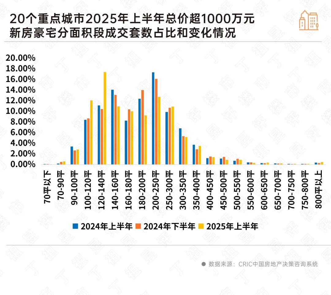 一方面,大面积豪宅180平以上顶豪户型仍是当前成交主力但集中度下降,据CRIC监测数据,2025年上半年全国20个核心城市千万豪宅成交中,面积在180平以上的产品成交占比达到46.14%,在各面积段中占比居首,但是成交集中度稳步下降,环比下降8.11个百分点,同比下降5.26个百分点。