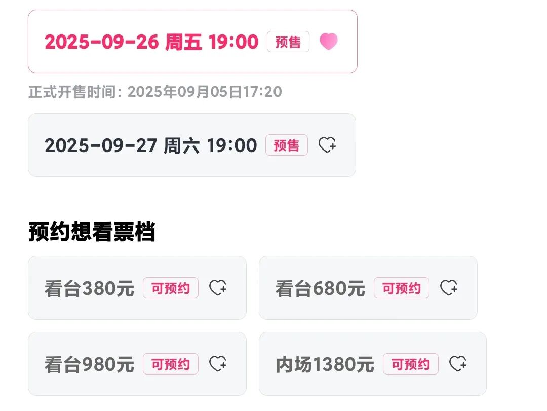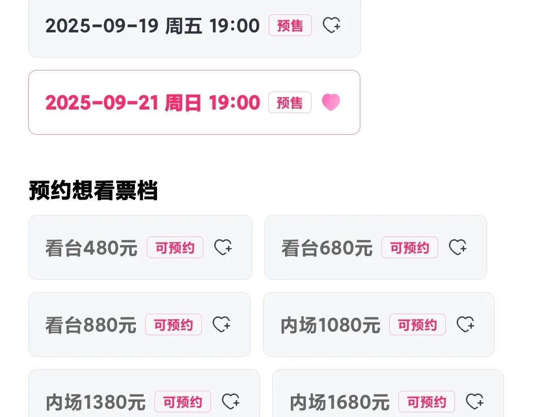 以9月最近演唱会的大麦票价数据显示,最高的内场票大概在1380-1680元,中段的票价基本稳定在480-680元,最便宜的价位都在380元以上。