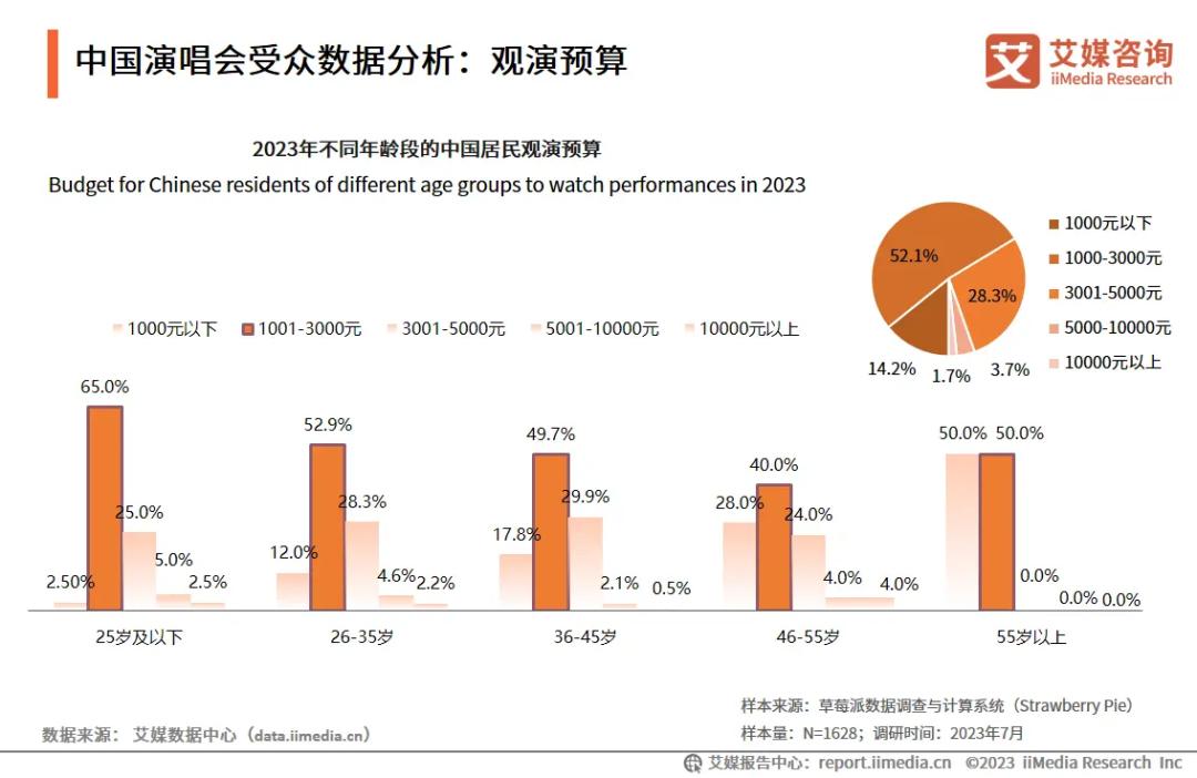 艾媒网数据显示,中国居民观看演唱会的预算集中在1000-3000元之间,其次为3001-5000元。
