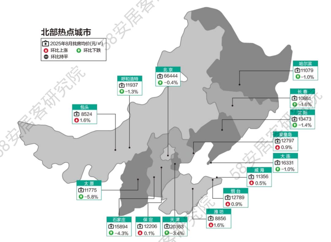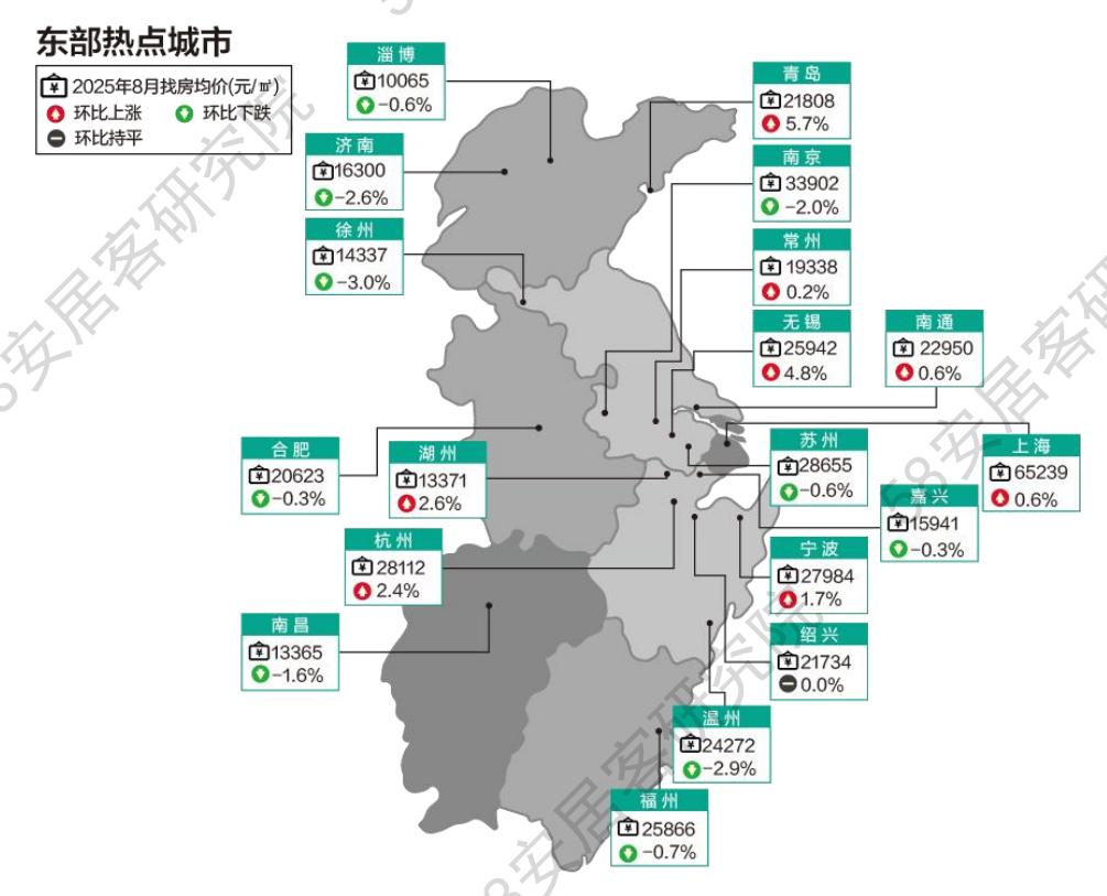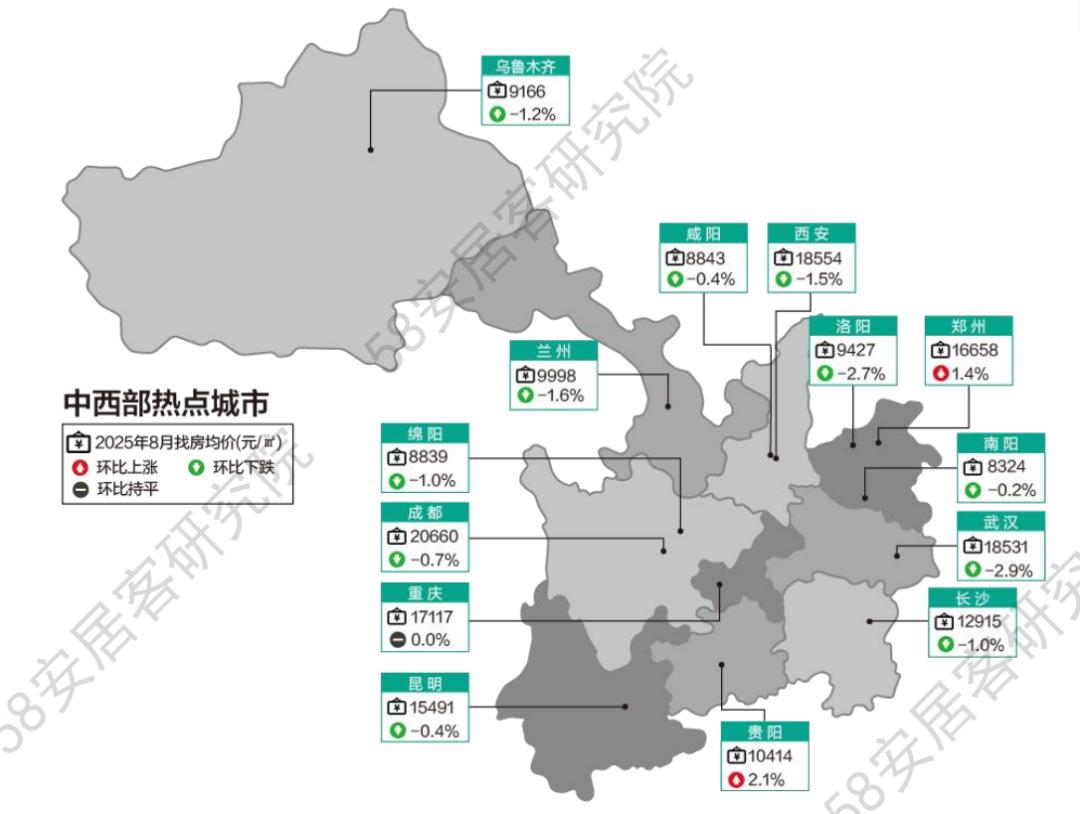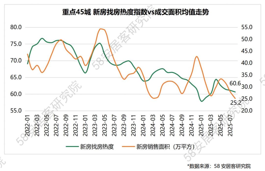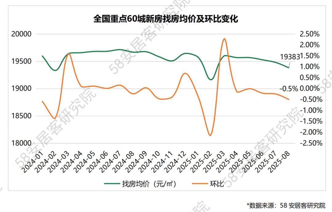 2025年8月,重点60城新房线上找房均价19383元/㎡,环比微降0.5%。60城中有20个城市新房找房均价上涨,2个城市平稳不变,38个城市新房均价下跌。