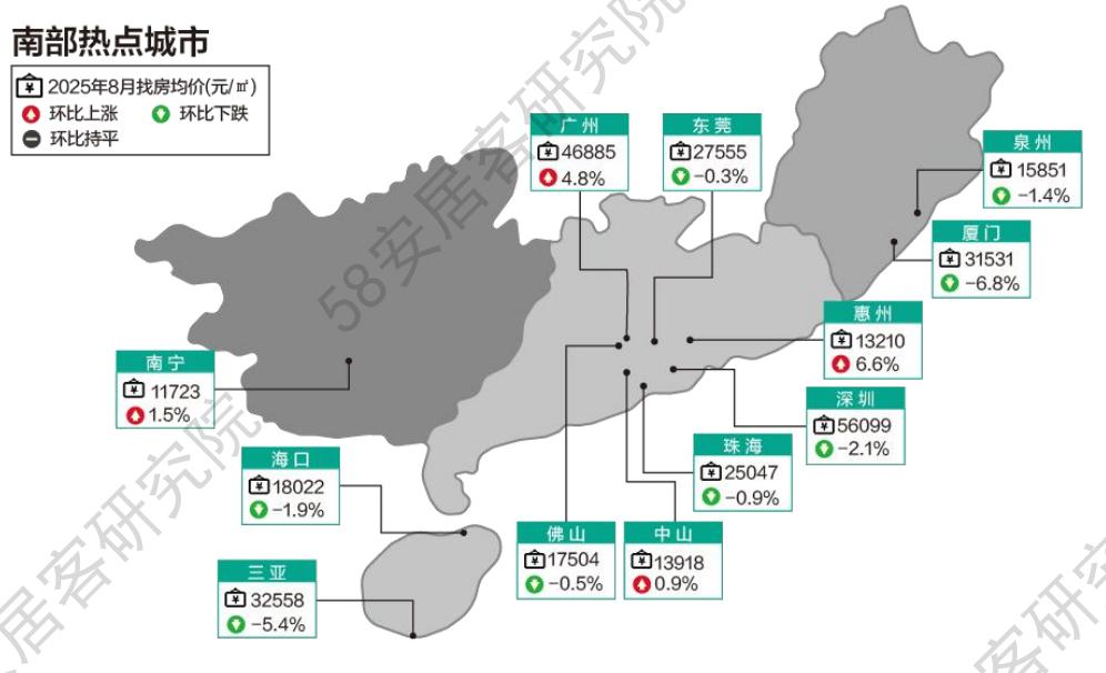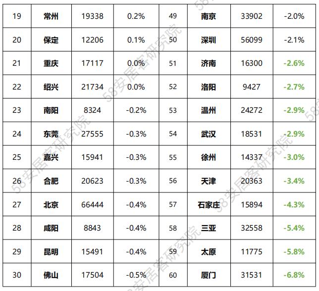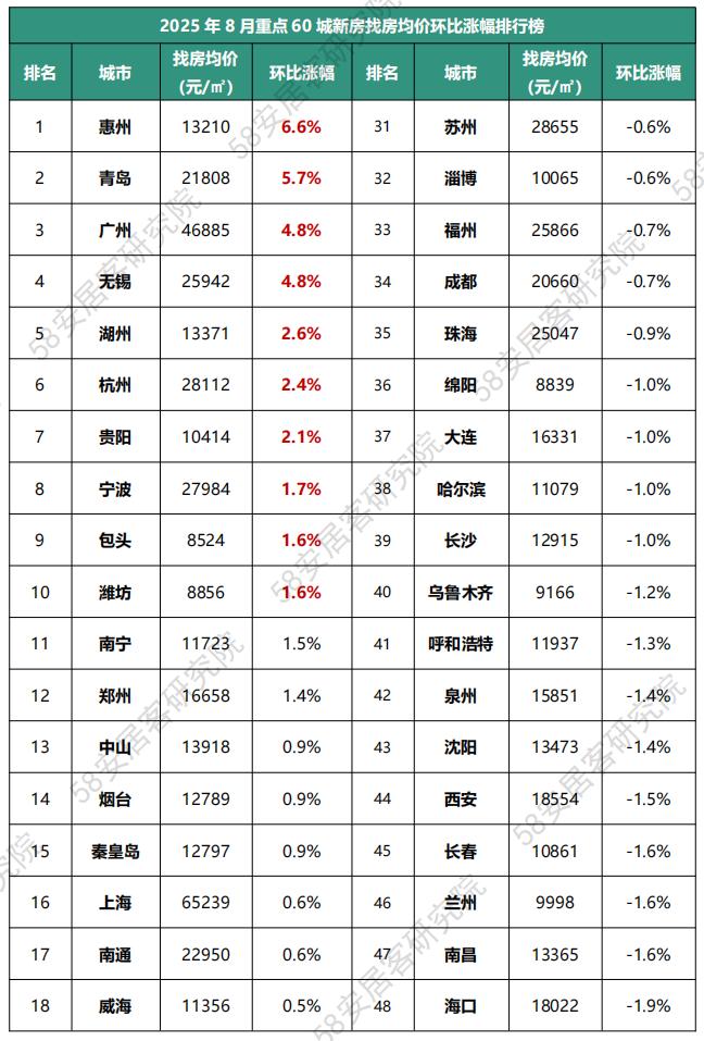 惠州新房找房均价环比上涨6.6%,在60个城市中居于首位,其次是青岛上涨5.7%,广州上涨4.8%;厦门新房价格下跌幅度最大,环比下降6.8%。