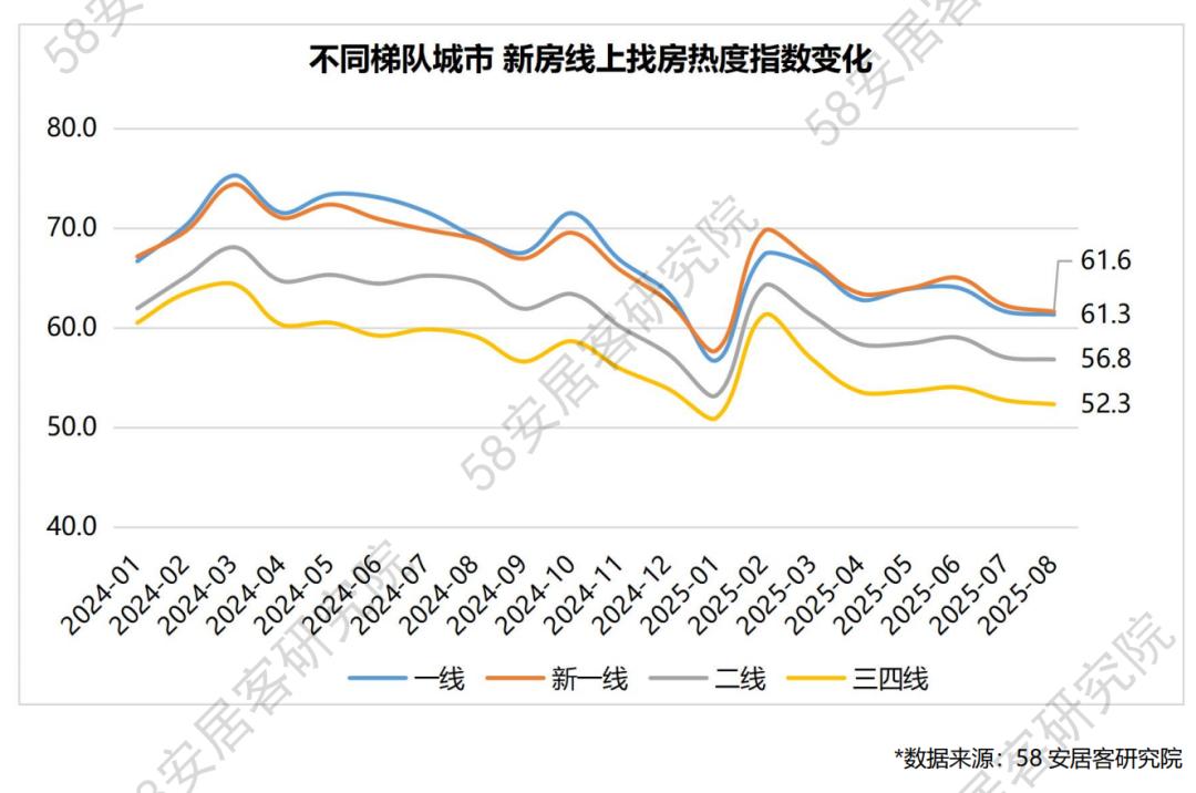 从各梯队城市来看,8 月一线、新一线、二线、三四线城市找房热度指数分别为 61.3、61.6、56.8、52.3,均较 7 月出现小幅回落。