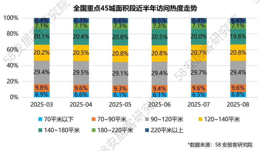 2025年8月全国45城中,新房市场分面积段找房热度占比格局相对稳定,90~120 平方米户型仍是市场主流需求,占比达 29.4%,环比7月减少0.3%。其次为120~140 平方米(20.8%),环比7月增加了0.1%,140~180 平方米(19.8%)环比下降了0.2%。