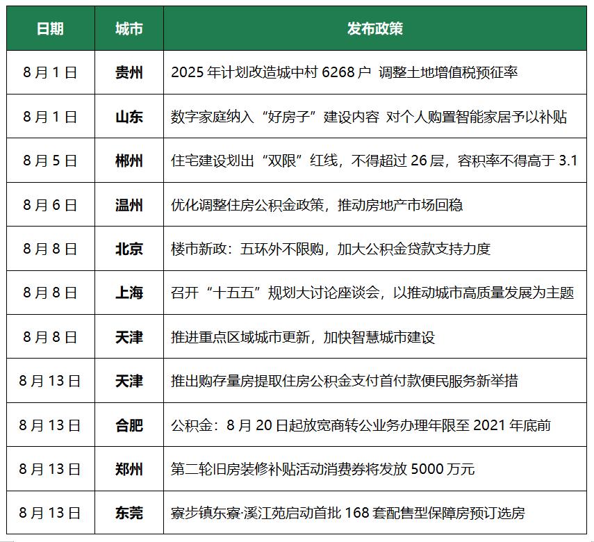 公积金政策方面亮点频出。8 月 8 日北京优化公积金贷款政策,部分购房者享首套房贷款优惠;13 日天津允许缴存人提取公积金付存量房首付,合肥放宽 “商转公” 年限;25 日上海个人购绿色建筑公积金贷款额度上浮,武汉二套公积金贷款额度提至 120 万元与首套持平。