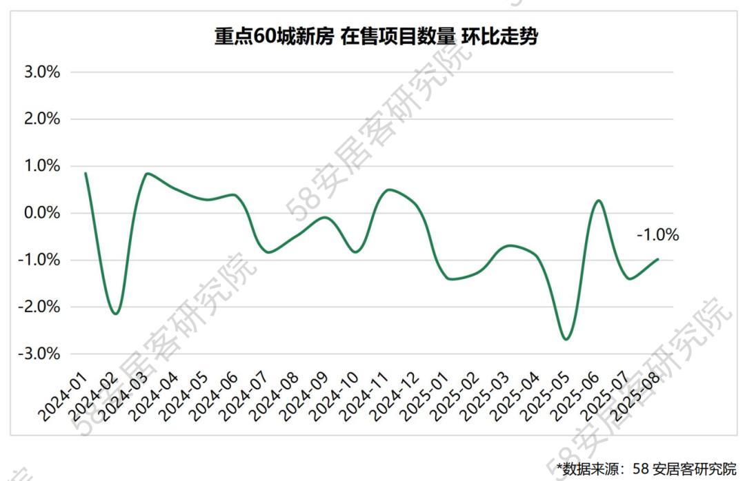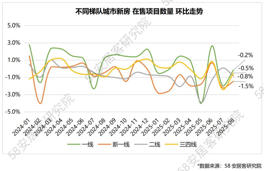 在58 安居客研究院重点监测的 60个城市中,新房在售项目量延续下降趋势,8 月环比下降 1.0%,市场新增供应节奏持续放缓。分城市梯队来看,一线城市在售项目量受整体市场环境影响较小,环比微降 0.2%;新一线城市降幅相对明显,环比下降 1.5%;二线城市环比下降 0.8%,三四线城市环比下降 0.5%,整体呈现 “高能级城市降幅收窄、低能级城市稳步调整” 的特征。