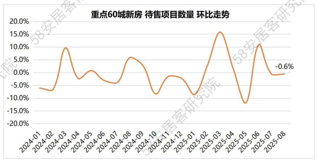 供应端:8月份,新房在售项目数量持续下降,60城新房在售项目量环比下降1.0%。新房项目待售项目量环比较为平稳,微降0.6%。