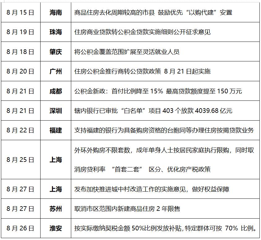 在放开限购限售方面:8月8日,北京明确符合购房条件的家庭在五环外购房不限套数,同时优化公积金贷款政策,部分购房者可享首套房贷款优惠;8月25日,上海宣布符合条件居民家庭在外环外购房不限套数;苏州取消市区新房满 2 年转让限制。