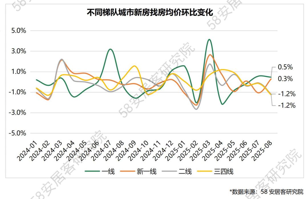 从不同梯队城市对比来看,四类城市找房均价环比涨幅分别为一线(0.5%)>新一线(0.3%)>二线(-1.2%)=三四线(-1.2%)