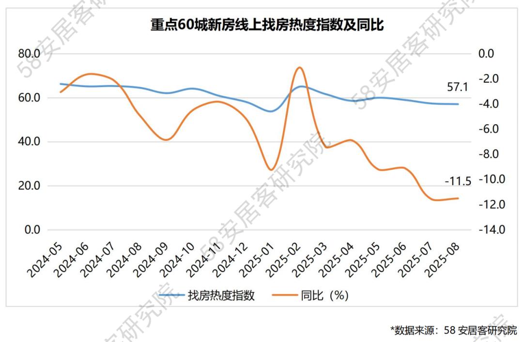 8 月全国重点 60 城新房找房热度同比下降 11.5%,降幅较 7 月(-11.6%)基本持平,市场需求端整体仍处于调整阶段。热度下降主要受两方面因素影响:一是新房在售项目量持续减少(8 月60城环比下降1.0%),供应端可选范围收窄;二是市场预期仍需进一步巩固,部分购房者观望情绪尚未完全缓解。