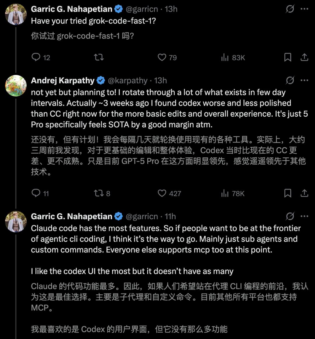 评论区,一位网友问Karpathy有没有尝试过grok-code-fast-1?