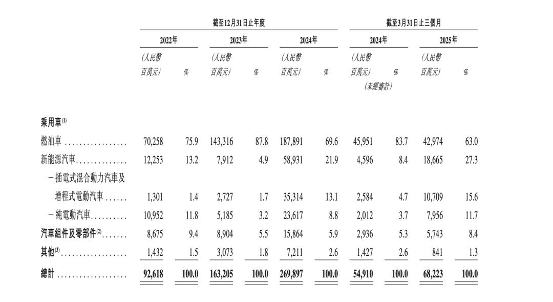 反映在收入上,燃油车业务贡献大头。根据招股书,奇瑞汽车2022年、2023年、2024年、2025年一季度的燃油车收入占比分别为75.9%、87.8%、69.6%、63.0%,新能源汽车收入占比分别为13.2%、4.9%、21.9%、27.3%。
