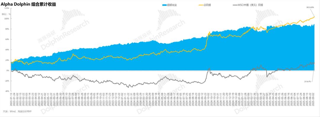 自组合开始测试(2022年3月25日)到上周末,组合绝对收益是104%,与 MSCI 中国相比的超额收益是89%。从资产净值角度来看,海豚君初始虚拟资产1亿美金,截至上周末超过了2.07亿美金。