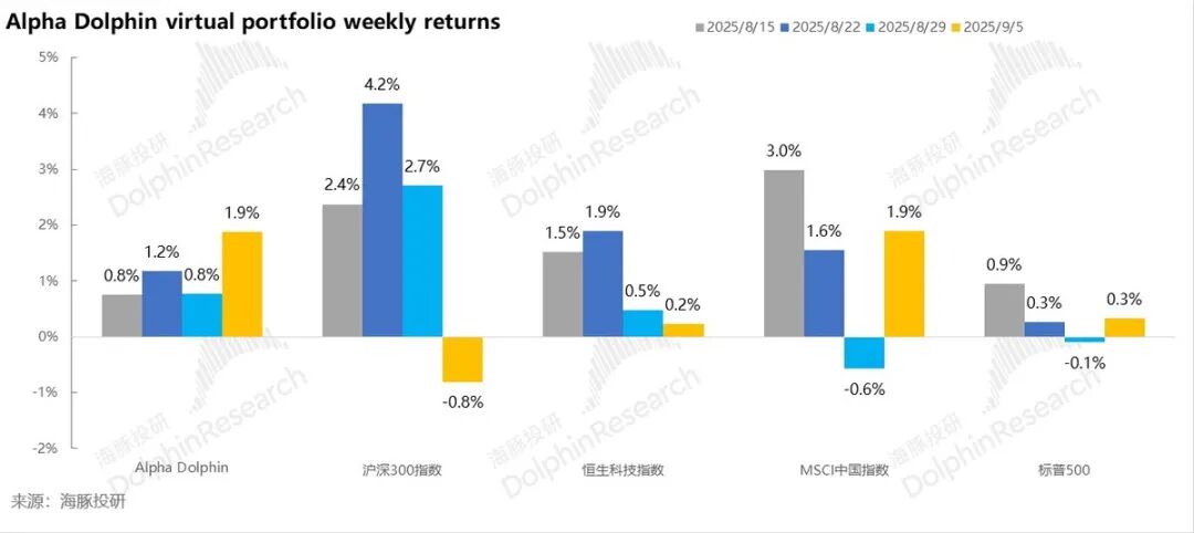 上周,海豚投研的虚拟组合Alpha Dolphin未调仓。当周上行1.9%,跑平MSCI中国指数,跑赢恒生科技(+0.2%)、标普500(+0.3%)、沪深300(-0.8%)。