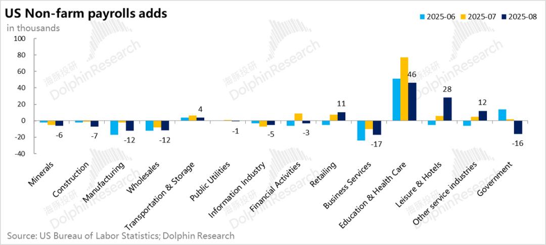 8月正增长的主要只有零售服务(主要是日用品零售)、医疗健康行业和餐饮服务业。