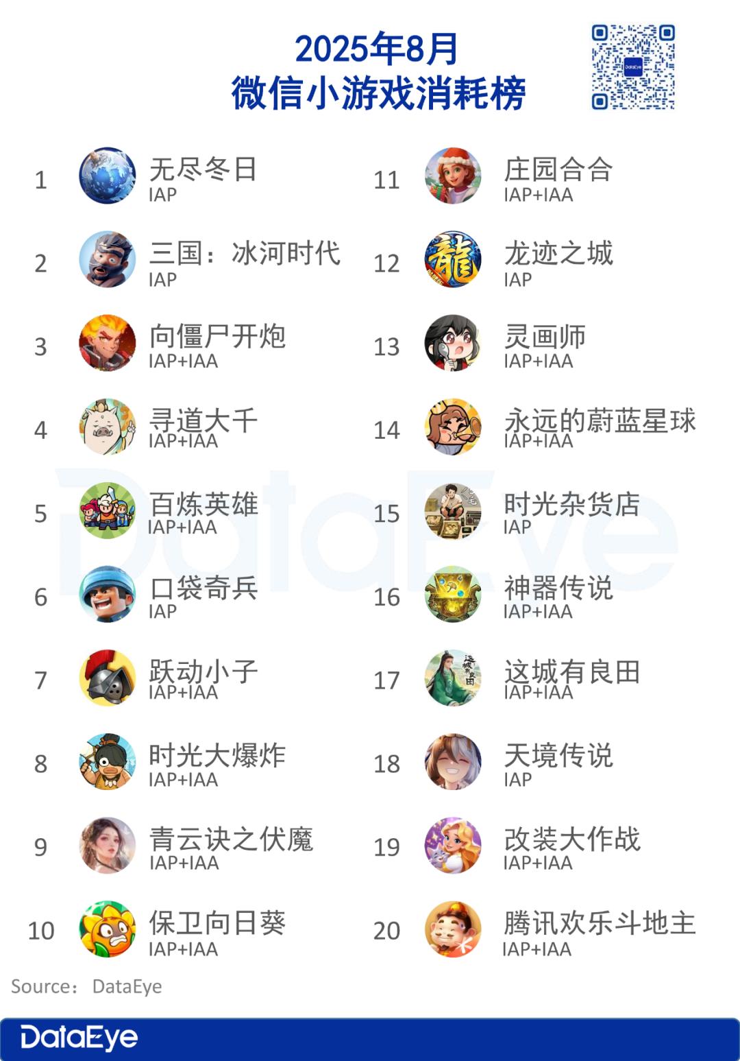 消耗第一梯队:战争策略依然稳定,模拟经营品类崛起。战争策略品类的消耗占比大盘约20.05%,与7月的消耗占比基本持平,稳坐小游戏大盘的主要消耗品类,头部产品《三国:冰河时代》《无尽冬日》继续保持较高的消耗表现,其中《无尽冬日》在8月消耗增长飙升,重新登顶月度消耗榜。