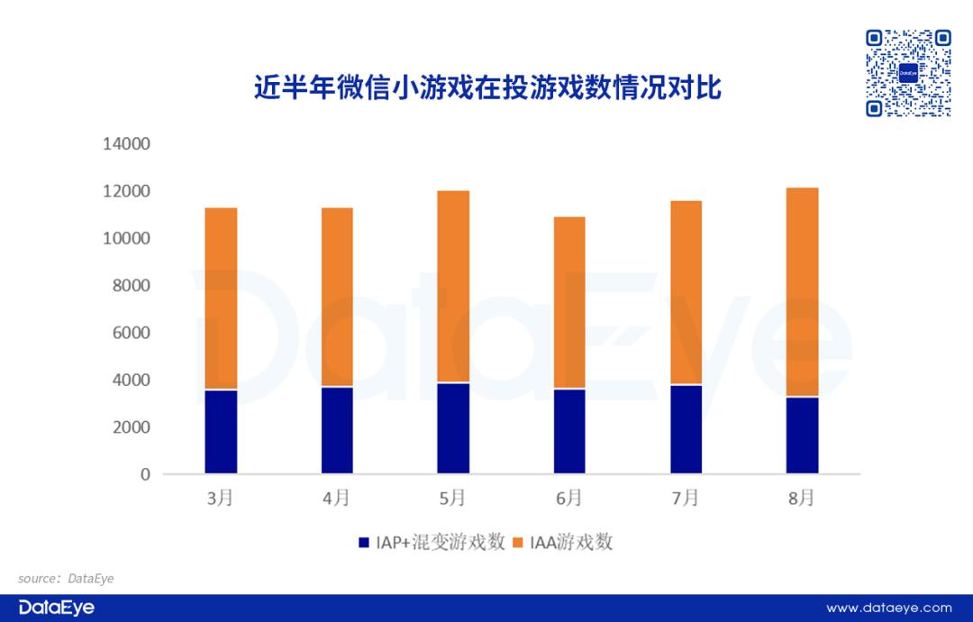 素材量 方面,DataEye-ADX投放数据显示,8月微信小游戏投放素材量 (图片+视频)约为203万,环比7月下滑11.2%。8月小游戏市场进入暑期档尾期,部分厂商逐渐降低素材投放量。从降幅来看,IAP+混变游戏相关素材下滑超过12%。