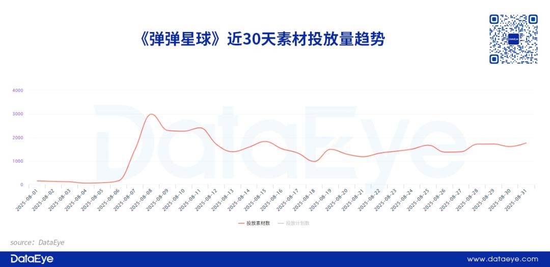 4399《弹弹星球》排名月度消耗榜第6名,消耗增长明显,主要原因是同类型竞品第七大道《新弹弹堂》具备先发和IP加持优势,《弹弹星球》作为后发产品,项目组需要思考如何快速抢量。DataEye-ADX投放数据显示,《弹弹星球》在上榜前两天突然提升投放量,单日投放素材数升至1400条,而次日达到投放数量峰值,单日接近3000条。