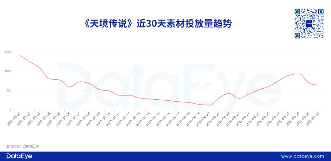 《天境传说》由冰川网络发行,属于放置卡牌品类。DataEye-ADX投放数据显示,8月投放素材量整体强势,8月中有明显回落,而月尾则继续拉升。