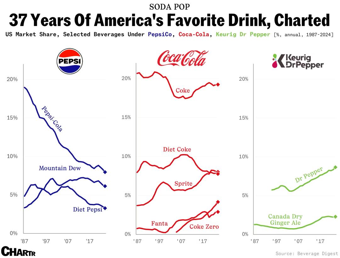 值得一提的是,百事并非没有利用自身优势反击。它充分借助了在华快餐渠道的布局——毕竟全国成千上万家的肯德基和必胜客,用的都是百事的饮料。不过令人尴尬的是,即便背靠如此庞大的餐饮盟友,百事仍未能在总体市场上撼动可口可乐的地位。