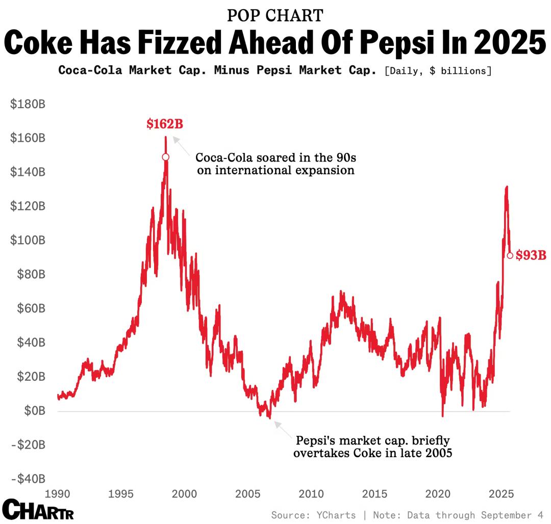 一个直观的对比是市值:截至当下,可口可乐的市值约2975亿美元,而百事只有约2048亿美元。两者相差接近千亿美元,创下近25年来最大差距。上一次出现如此悬殊的市值鸿沟,还要追溯到上世纪90年代末。1998年时,可口可乐市值高达1652亿美元,百事仅595亿美元,相差约1057亿美元。