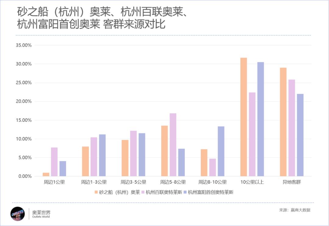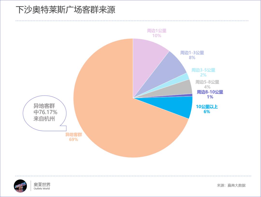 尽管下沙奥莱实际并不在杭州范围之内,而属嘉兴海宁,但因处于两市交界处,位于杭州绕城高速下沙出口处2公里,西靠下沙大学城,南临钱塘江著名观潮区,距杭州市中心武林广场25公里,车程约30分钟。因此,在近年杭州以外地市的客流增速更快的情况下,下沙奥莱依然有50%的客群来自杭州。