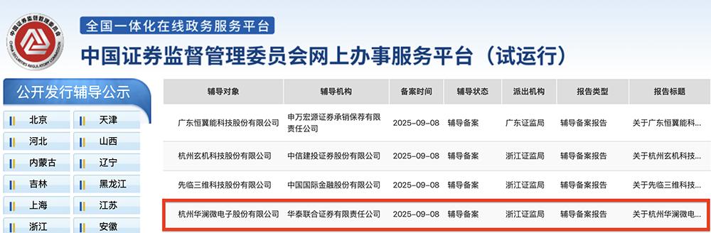 芯东西9月9日报道,9月8日,浙江杭州存储控制器芯片企业华澜微在浙江证监局办理辅导备案登记,正式启动A股上市进程,辅导机构为华泰联合证券。