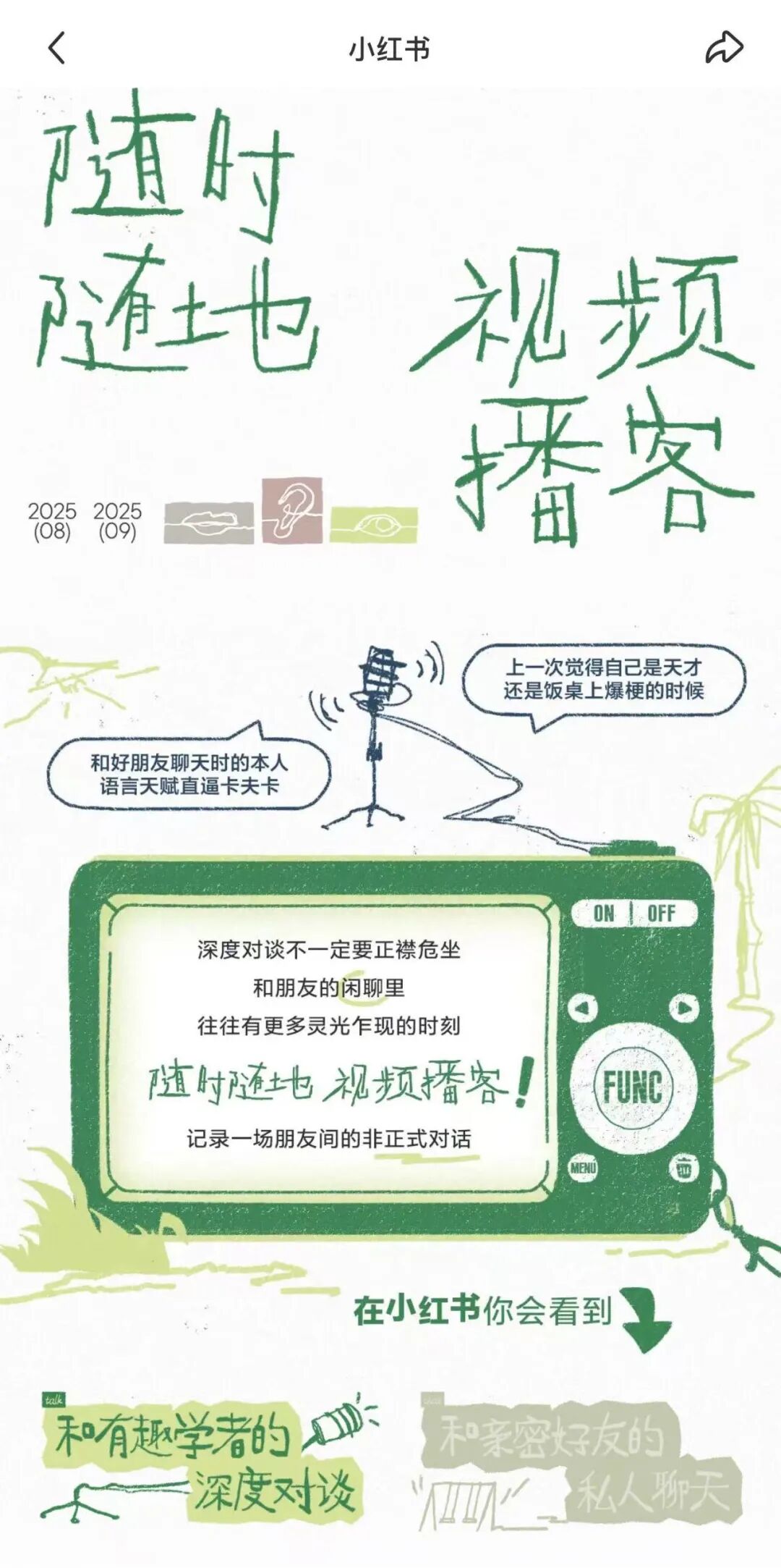 小红书则采取了更加轻量化和社区化的路径。2023年年初,小红书就开始与多档播客推出独家视频节目。今年八月,小红书科学薯推出创作活动“随时随地视频播客”,倡导用户发布聊天内容,规定时长在15-20分钟之间,并指定三个内容方向,参与者可随机获得5-30万流量曝光。