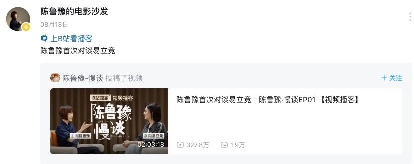 而鲁豫的《陈鲁豫·慢谈》虽然不像综艺人播客那般具有趣味性,但具有深度的访谈也是能让观众感受到大咖的思想,了解嘉宾的人生经历。整体而言,这一轮视频播客的高播放量,一定程度上都是源自于内容的深度,而深度往往一定时间才能被感受到,这也是短内容、“金句”所无法实现的。