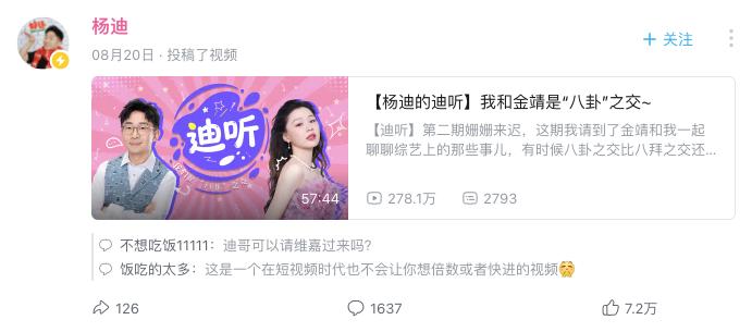 名人主导的节目确实取得了亮眼数据:于谦和蔡明的视频收获249万播放,鲁豫与易立竞的对谈达到327.6万次观看,杨迪与金靖的节目也获得278万播放量。这些数据印证了名人效应在初期的引流作用。