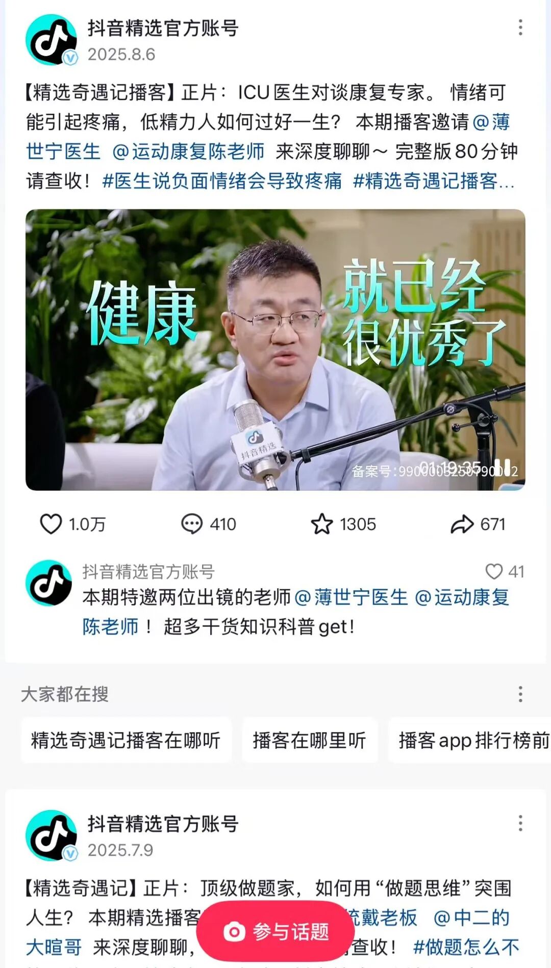 抖音旗下中长视频APP抖音精选也在跟进,在应用内容内上线视频播客《精选奇遇记》,并在播客平台同步节目音频。