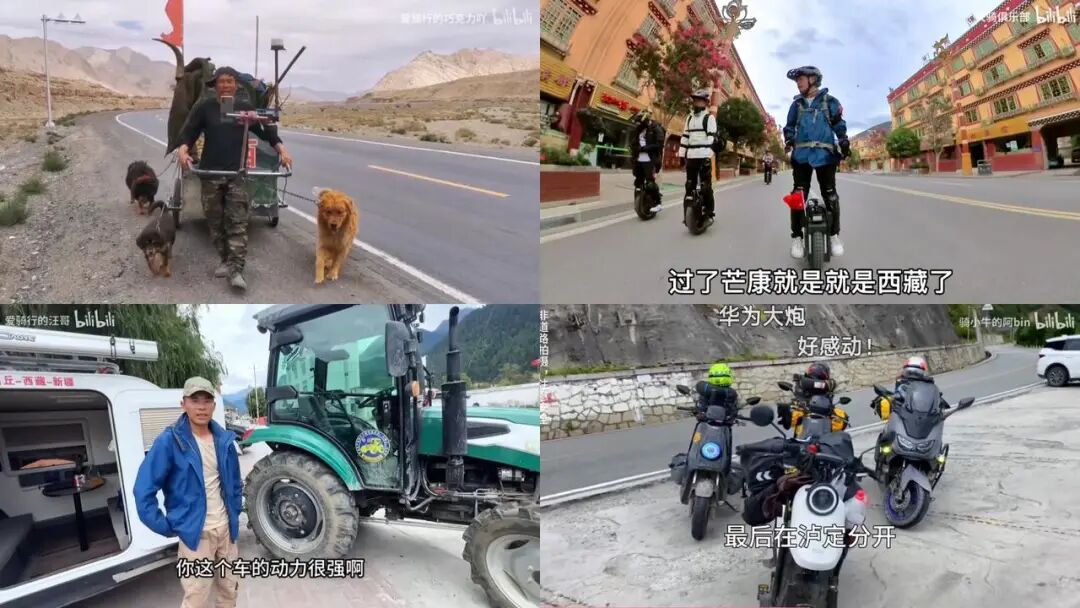 从电瓶车、拖拉机到挖掘机,再到自行车、步行、人拉着车步行,甚者还有人踩着独轮车、滑板车进藏……