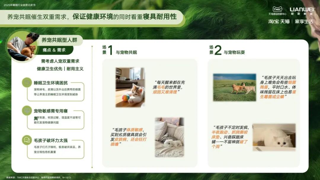 养宠共眠型人群。他们是与猫毛尿渍作战的「卫生指挥官」。根据TMIC数据,宠物共眠场景的核心矛盾在于保证健康环境与寝具耐用性。因此,该群体会优先选择具备抑菌卫生、防水防污易清洗、耐撕咬三重特性的家纺产品。这种技术整合的本质,是在不牺牲人宠亲密互动的前提下,构建健康可持续的睡眠卫生环境。