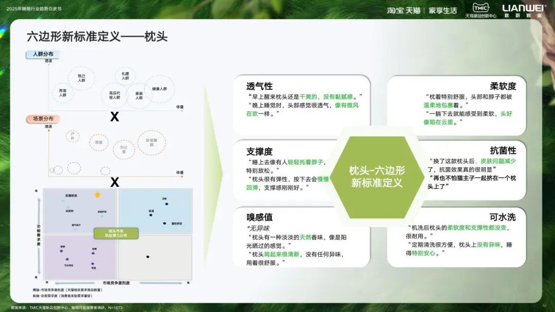 三是设计哲学转型。从“单极性能”到“体验六边形”,家纺设计告别功能单极时代。无论是被子、枕头之类的内芯还是外在的套件,都有自己的六边形新标准。比如,《白皮书》对枕头的六边形新标准定义,由透气性、支撑度、可水洗性、抗菌性,柔软度、嗅感值来共同建构。