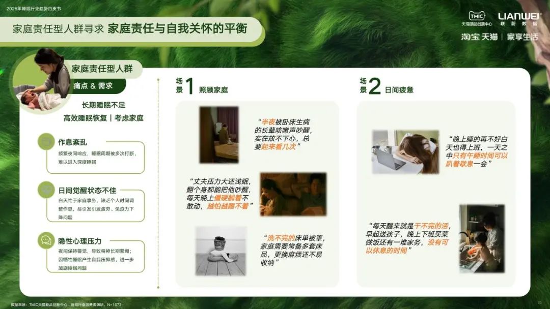 家庭责任型的已婚已育群体是游走在育儿养老之间的「生活平衡家」。深夜孩子吐奶浸透床单,隔壁老人咳嗽声穿透墙壁,家务压力与健康关切双重挤压睡眠空间。他们需要的解决方案直指家庭责任与睡眠效率的平衡。便捷易收纳的可拆洗拼接床品、抗皱耐用的环保材质帮助履行家庭照料义务,透气抗菌静音产品守护自我睡眠质量。