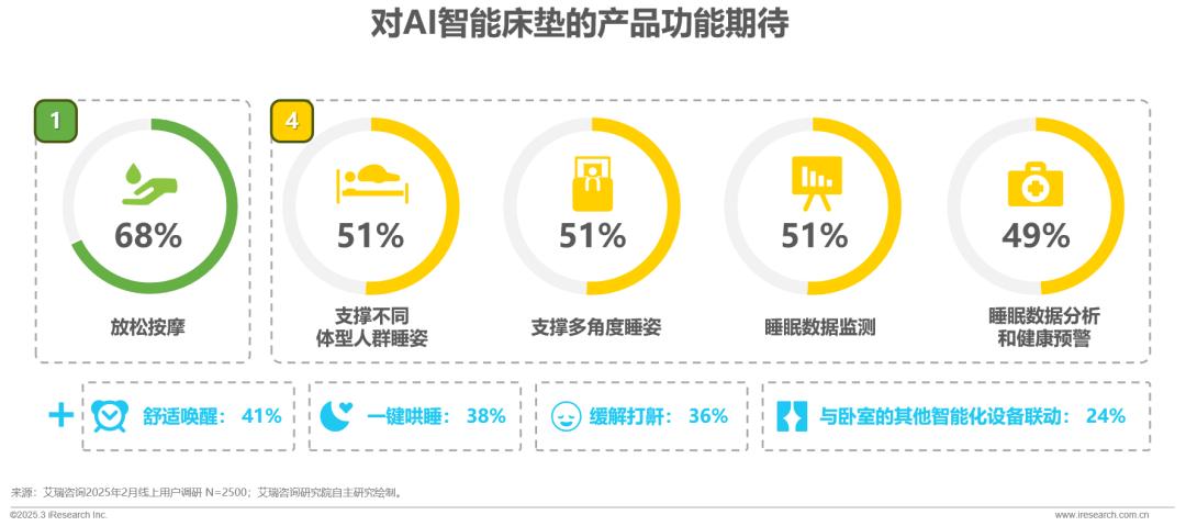二是智能赋能。智能技术从噱头进化成睡眠管理中枢。根据艾瑞咨询数据,AI智能床垫将成为中国睡眠消费新品类,68%的消费者希望能通过AI智能床垫进行深度的放松按摩,帮助他们入睡。