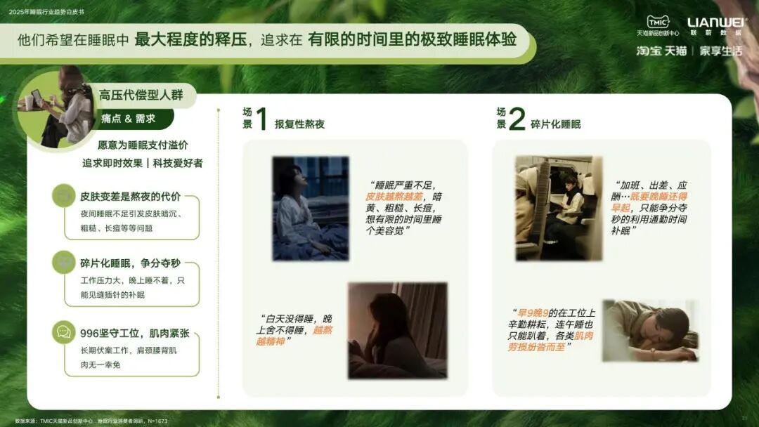 高压代偿型群体是向时间抢地盘的「碎片捕手」。加班偷走整觉,零碎补眠却越睡越昏沉。有即时助眠的科技加持产品是他们的心头好,同时他们也愿意为枕头和套件支付溢价。智能化体验、改善肩颈问题、减压、驱蚊、凉感,能让用户舒适入睡的功能多多益善。