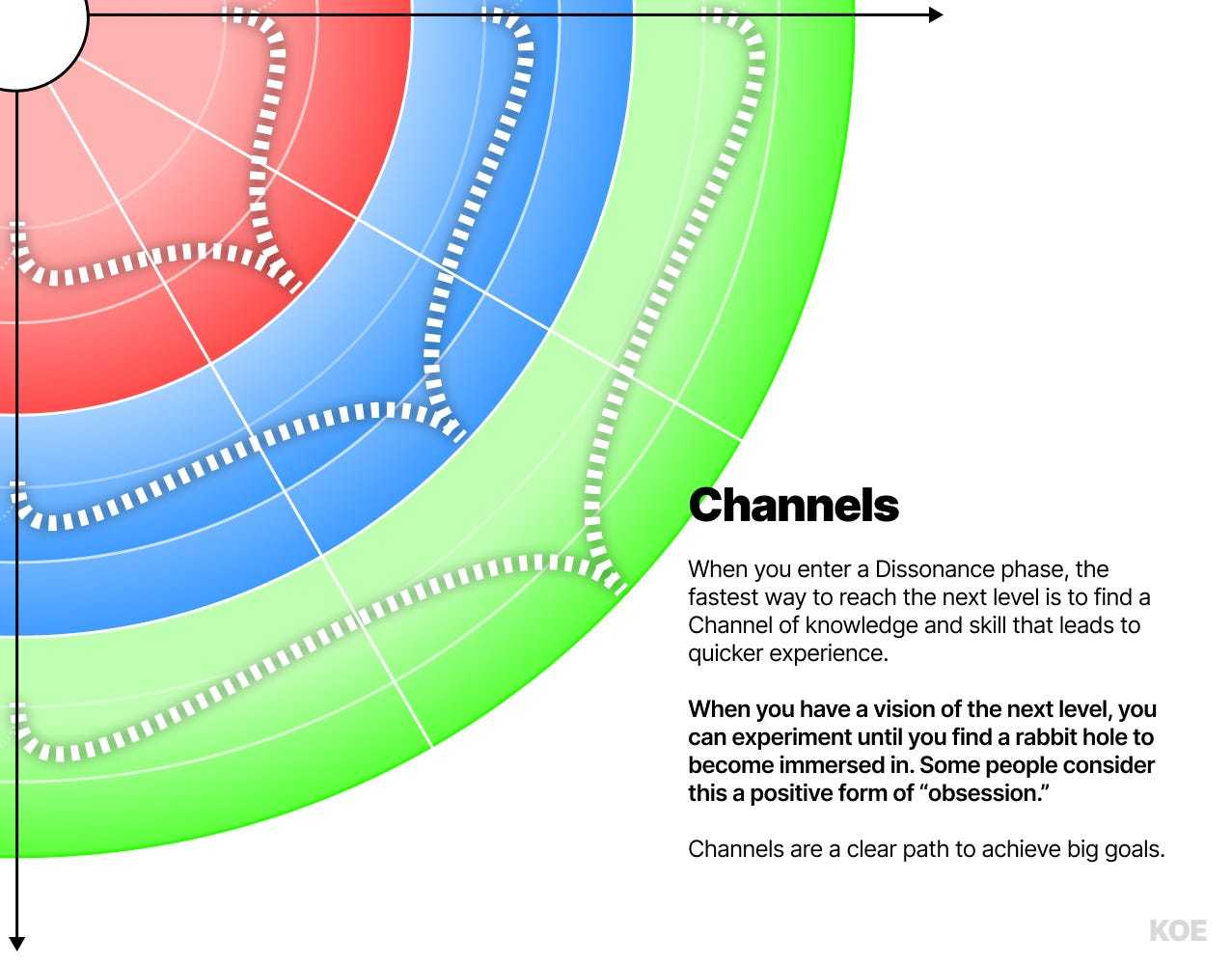 首先,你必须在完全适应当前层级后,达到“失调阶段”。一旦你对现状感到厌倦,并且没有对问题麻木不仁,你就可以利用这种厌恶感作为燃料,推动自己进入未知。你在特定象限(比如身体)内设定一个目标、愿景或方向。你开始获取知识和技能。你学习并实践。你犯错并修正你的目标。你不断实验,直到找到那个让你沉迷其中的“通道”。