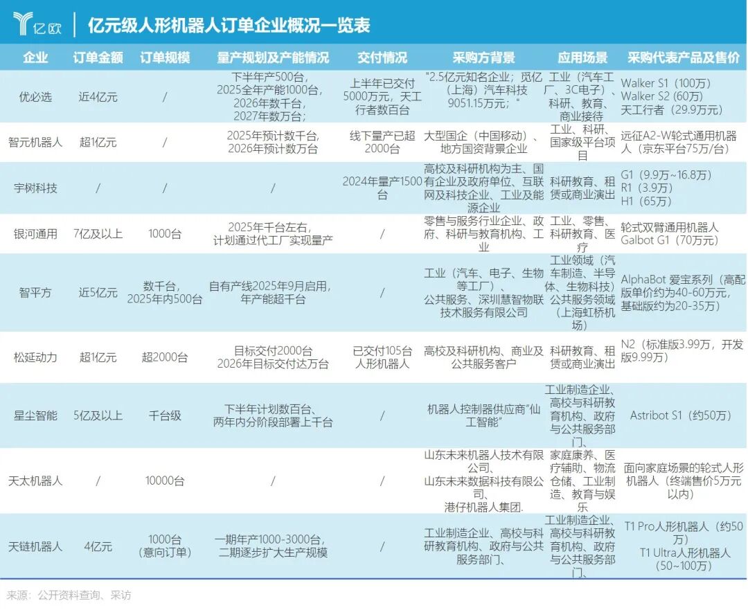 中小规模订单在不同企业间呈现出明显的分层特征。众擎机器人处于该梯队的领先位置,联合创始人姚淇元透露,其大的框架订单多为千万级别,2025年预计交付约500台,月产能在今年四季度已爬升至100~150台。