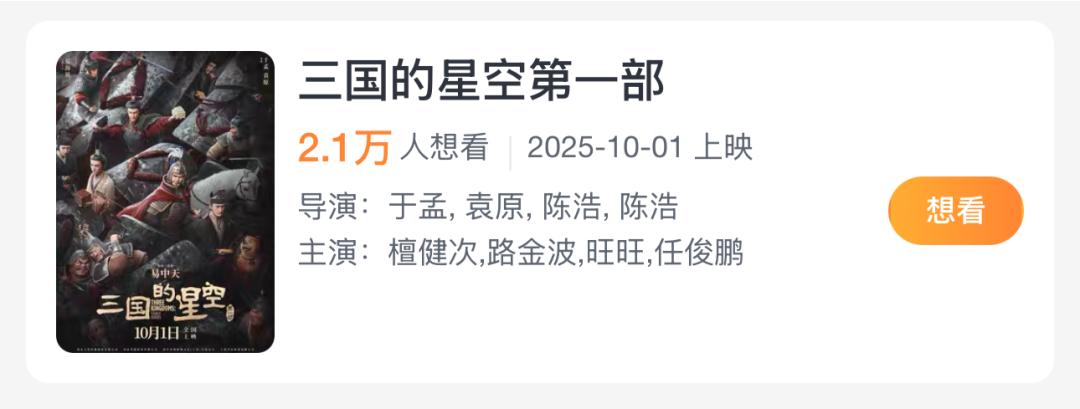 《三国的星空第一部》虽然票房预期不会太高,但是本次国庆档最值得关注的类型片之一。首先在《哪吒2》创下纪录后,国产3D动画与传统文化的结合势必有新一轮高潮,暑期档追光动画的《兰若寺》失利,但光线与追光在经典文学IP上的竞争已经全面铺开——光线首先在暑期端上了以曹操为主角的《三国的星空第一部》,这就让追光仍在制作的《三国:争洛阳》有些尴尬了,后者放出的首个短预告的主角同样是曹操。